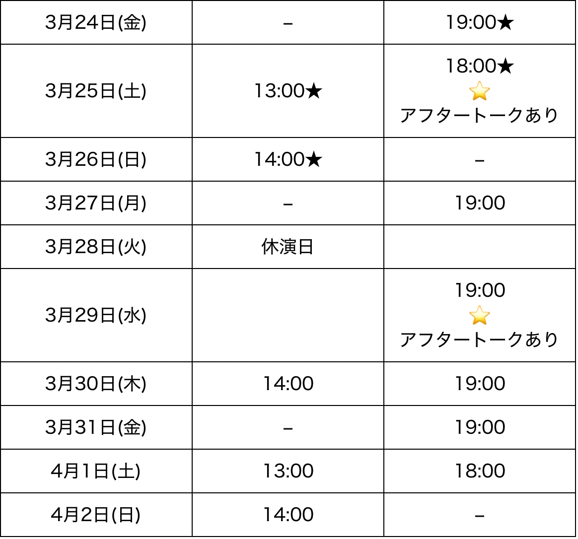 休演日 | 19:30 | 19:30 | 14:00 | 上演時間 1時間30分(予定) |